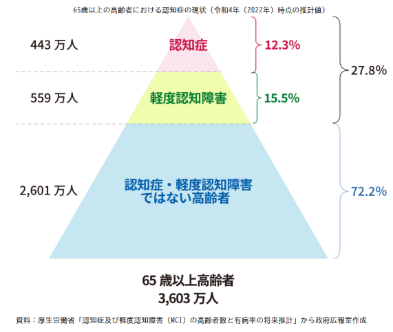 65歳以上の高齢者では認知症の人の割合は約12%、認知症の前段階と考えられている軽度認知障害(MCI)の人の割合は約16%とされ、両方を合わせると、3人に1人が認知機能にかかわる症状があることになります。