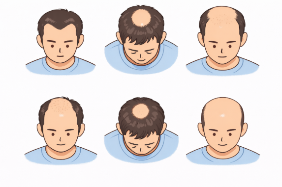 加齢とともに額の生え際や頭頂部の髪の毛が細くなったり毛量が減少しはじめ、徐々に進行していきます。